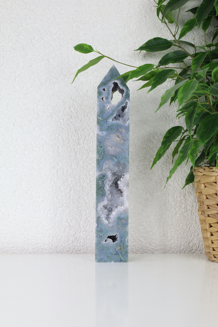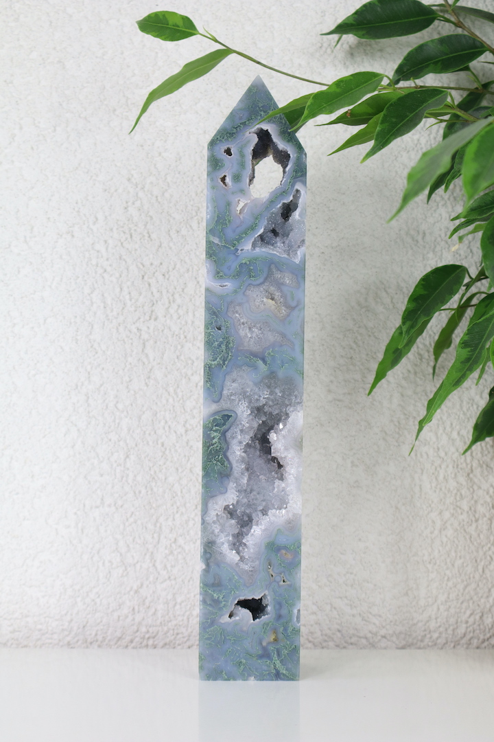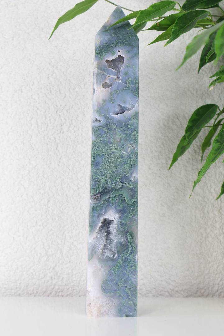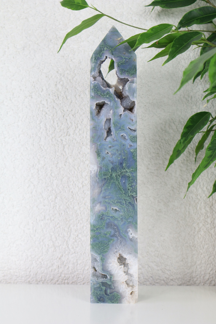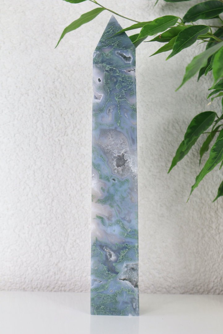 Ontdek de helende kracht van de natuur met deze prachtige Mosagaat Toren. Deze steen bevordert emotioneel herstel, balans en kalmte, ideaal voor spirituele ruimtes.
