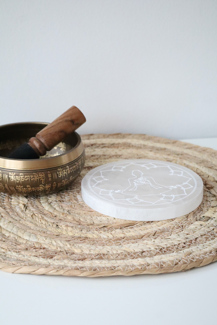 Deze seleniet meditatie schijf is ontworpen als een anker van rust in je dagelijkse leven. Met haar zachte, lichtdoorlatende structuur en het verfijnde gegraveerde meditatiefiguur met Ohm-symbool brengt zij je direct terug naar het moment. Een stille herinnering om te ademen, te vertragen en bewust aanwezig te zijn.