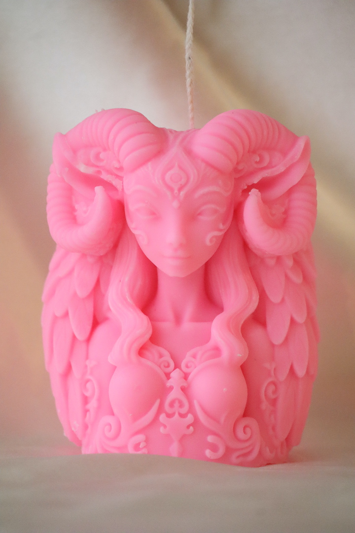 De Ram Godin wordt vaak geassocieerd met het begin van een nieuwe cyclus. Met haar zachte roze tint brengt deze kaars balans tussen daadkracht en zelfliefde. Plaats haar op een altaar, in je slaapkamer of in een rustige hoek van je huis waar je momenten van reflectie creëert.
