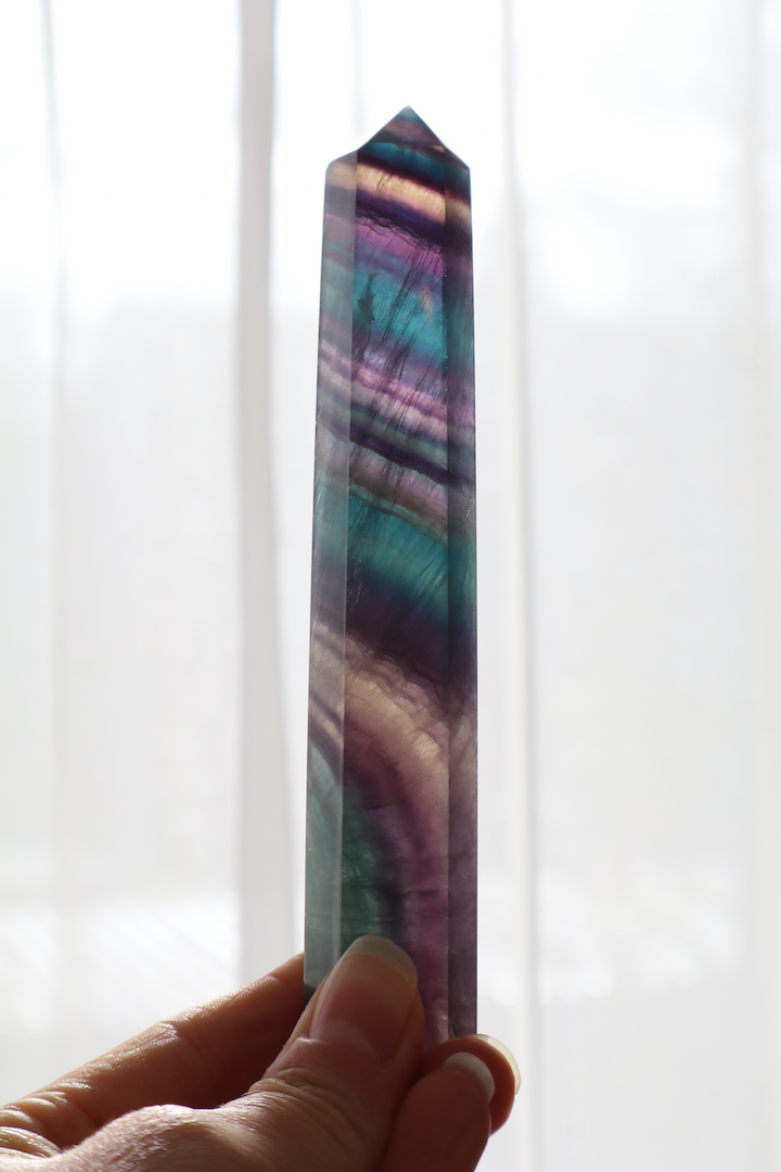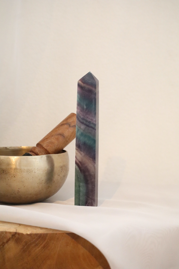 Elke Regenboog Fluoriet toren is uniek in kleur en tekening — wat haar tot een bijzonder en persoonlijk object maakt. De steen wordt zorgvuldig geselecteerd op kwaliteit, kleurintensiteit en energetische zuiverheid, zodat ze past binnen de verfijnde collectie van Spiritueel Wonen.