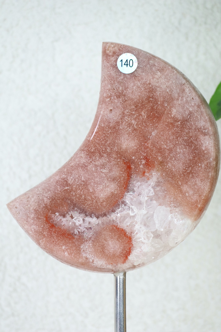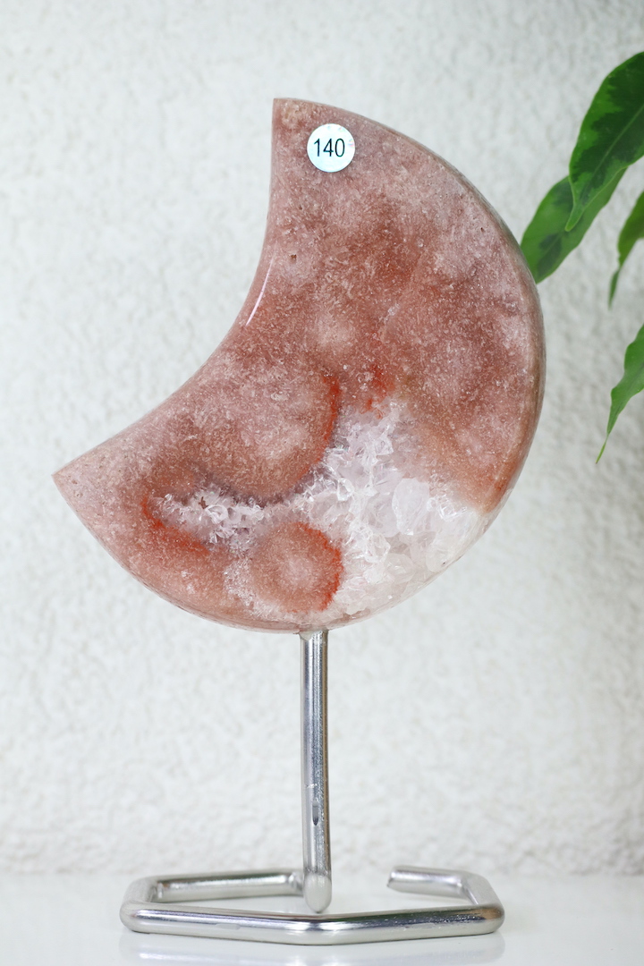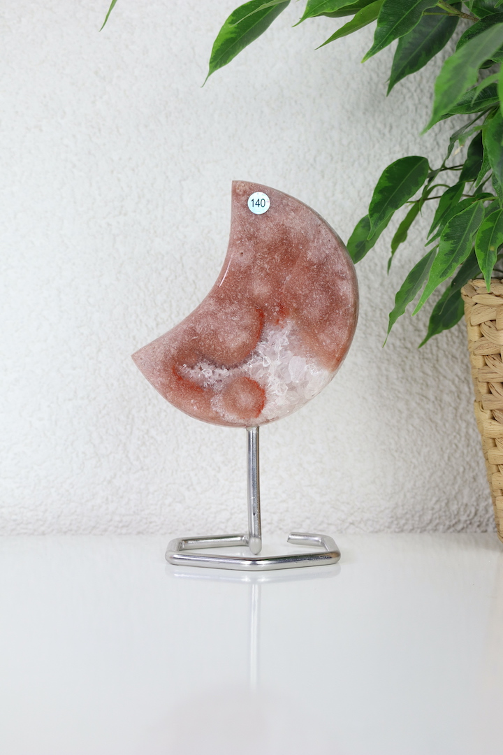 Deze Roze Chalcedoon met Kwarts Maan op standaard, ook bekend als Roze Amethist, straalt liefdevolle en helende energie uit. Perfect voor balans, spirituele groei en meditatie.