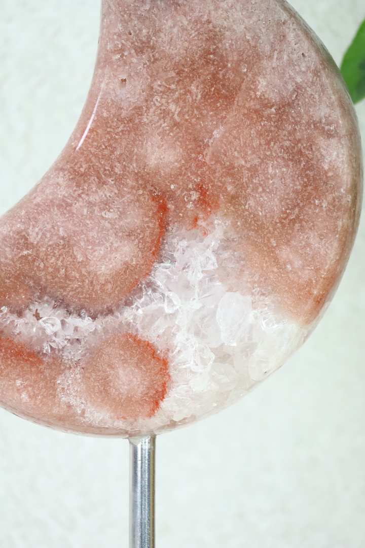De maanvorm symboliseert intuΓ―tie, vrouwelijke energie en transformatie. In combinatie met helder kwarts wordt de werking van Roze Chalcedoon nog verder versterkt, waardoor deze steen niet alleen emotioneel balancerend werkt, maar ook je spirituele bewustzijn verhoogt. De prachtige roze tinten en kristalachtige structuren maken dit een uniek en krachtig stuk voor je interieur en spirituele beoefening.