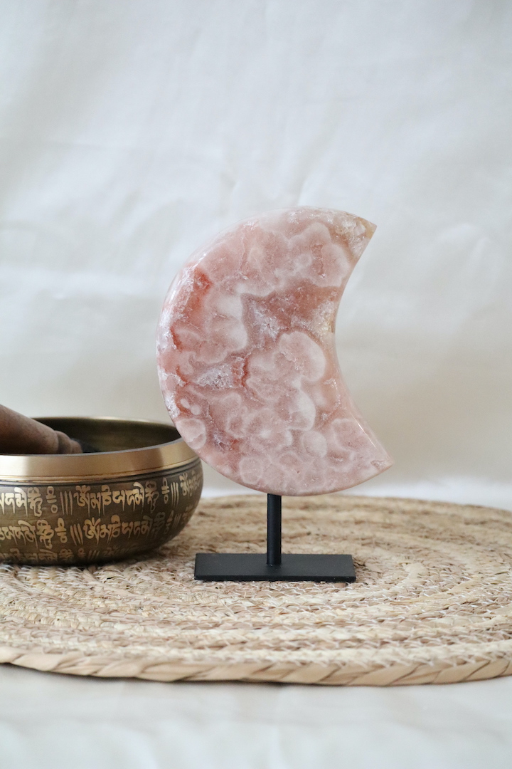Deze roze chalcedoon maan past perfect in een interieur waar rust, natuurlijke materialen en zachte tinten samenkomen. Ideaal voor een slaapkamer, meditatiehoek, woonkamer of praktijkruimte — als decoratief object dat niet domineert, maar ondersteunt.