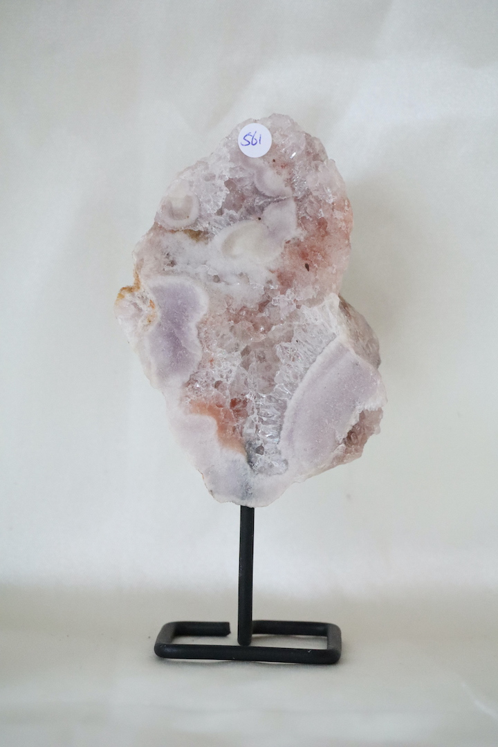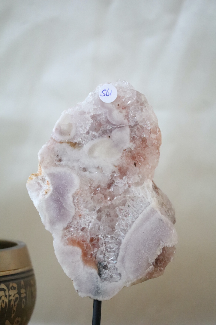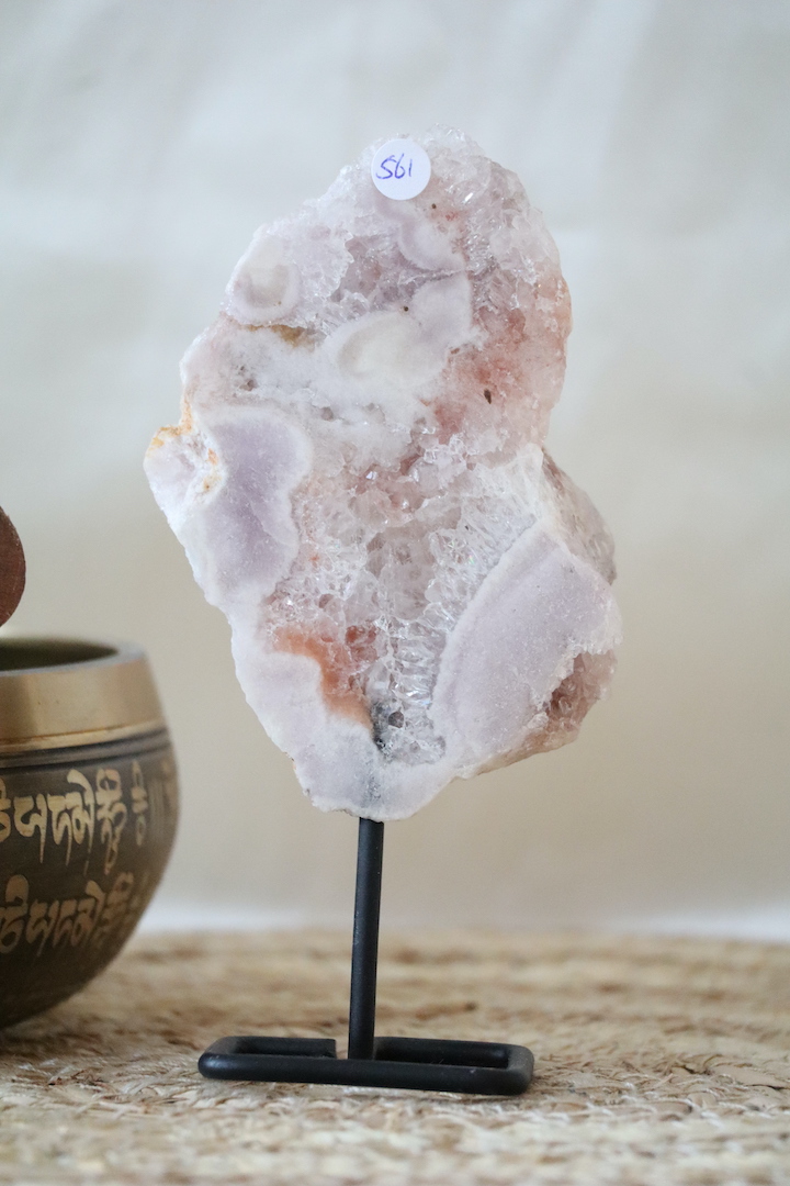 Deze Roze Chalcedoon met Kwarts op standaard is een verfijnd natuurstuk waarin rust, zachtheid en helderheid samenkomen. De zachte roze tinten van de chalcedoon vloeien organisch over in sprankelende kwartsstructuren, wat dit stuk een subtiele maar krachtige uitstraling geeft. Door de natuurlijke vormen en kristallijne textuur is elk exemplaar uniek – gevormd door de aarde, niet door de hand van de mens.