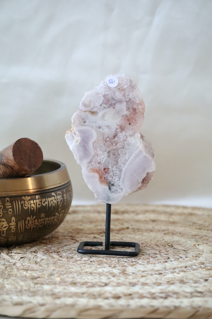 Een verfijnde Roze Chalcedoon met Kwarts op standaard (13 × 7 cm) met zachte roze tinten en sprankelende kristallen. Een elegant natuurstuk dat rust, zachtheid en helderheid uitstraalt – perfect voor een stijlvol en sereen interieur.
