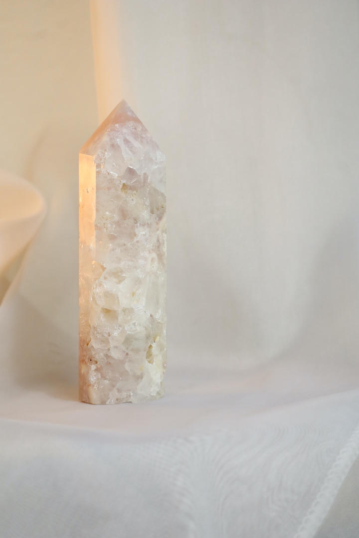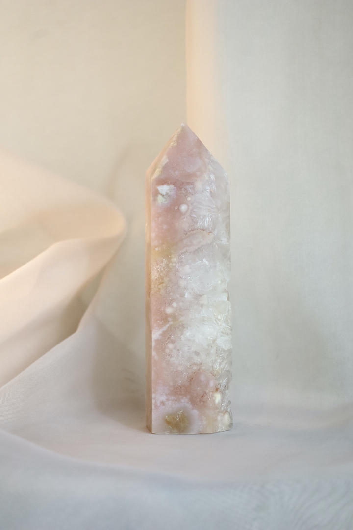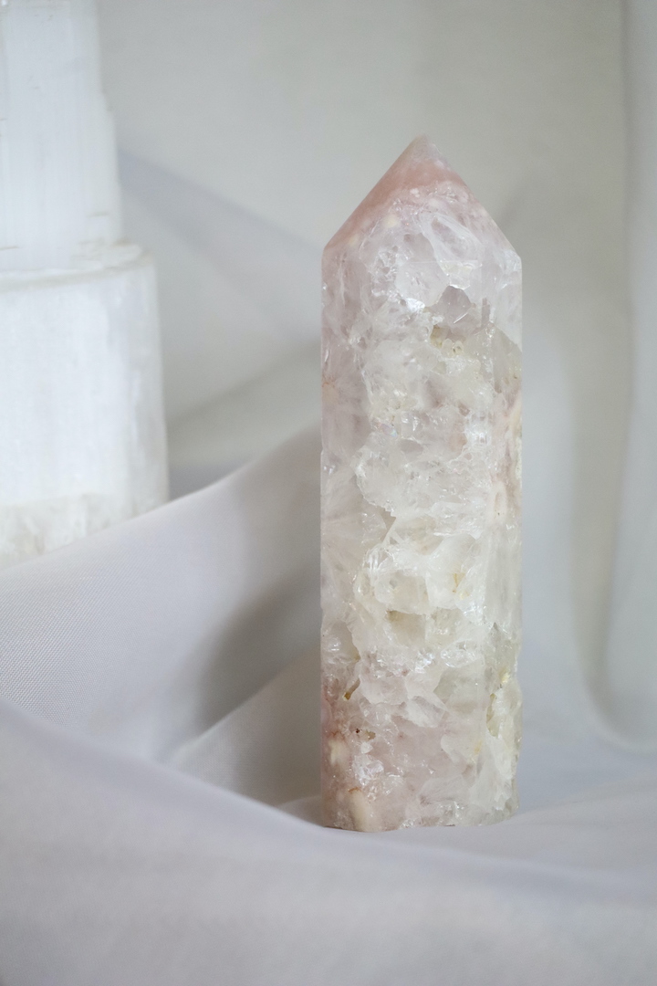 Een verfijnde Roze Chalcedoon met Kwarts toren uit Madagaskar (214 g, 12 x 3,5 cm). Zachtroze tinten en kristallijne structuren brengen rust, harmonie en subtiele hartenergie in je huis. Perfect voor self-care rituelen, meditatie en een serene Sacred Home sfeer.