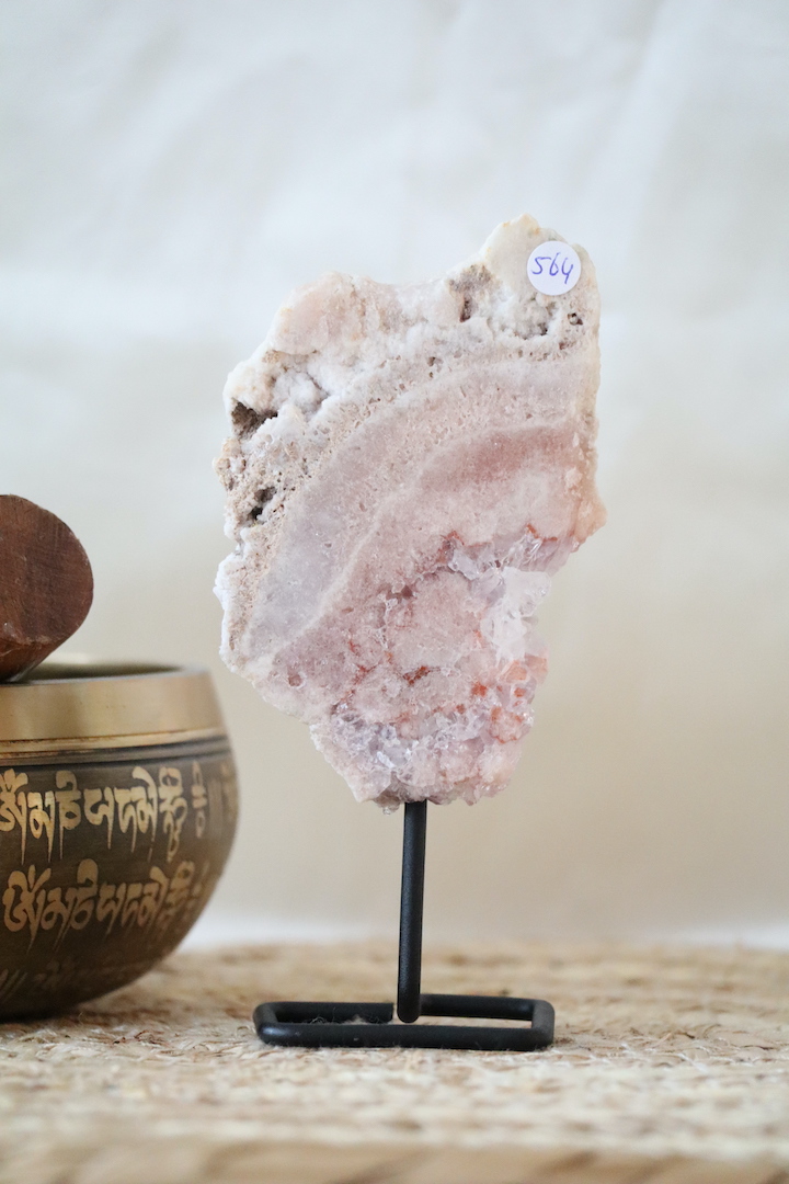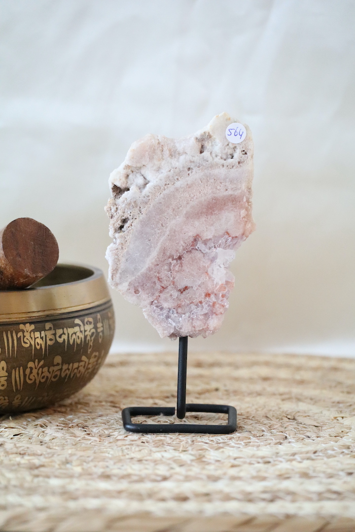 Deze Roze Chalcedoon op standaard valt op door haar gelaagde structuur en zachte, natuurlijke overgangen. De poederroze tinten lopen in vloeiende banden door de steen en worden afgewisseld met licht kristallijne delen. Dit geeft het geheel een rustige diepte en een bijna landschappelijke uitstraling — ingetogen, verfijnd en in balans.