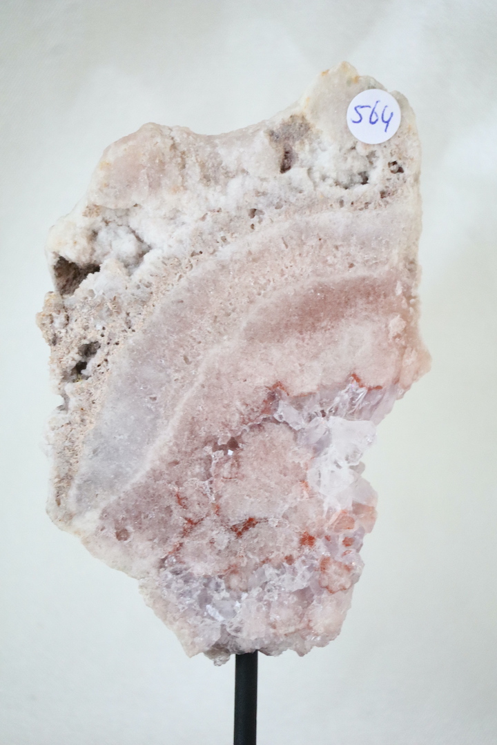 Roze chalcedoon staat bekend om haar zachte kleurtoon en kalme, melkachtige uitstraling. In dit exemplaar zijn duidelijke bandstructuren zichtbaar, ontstaan door natuurlijke afzettingen over lange tijd. Subtiele kristallijne delen zorgen voor textuur en lichtreflectie, zonder dat het onrustig wordt.