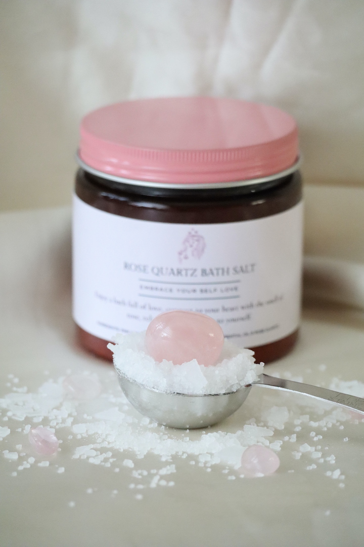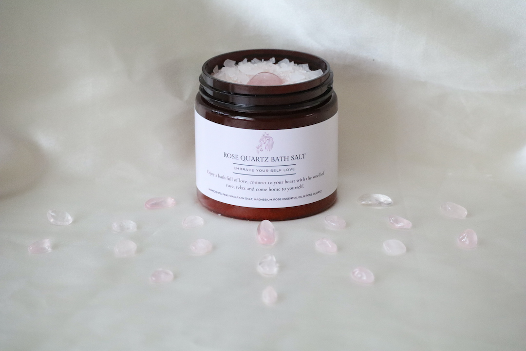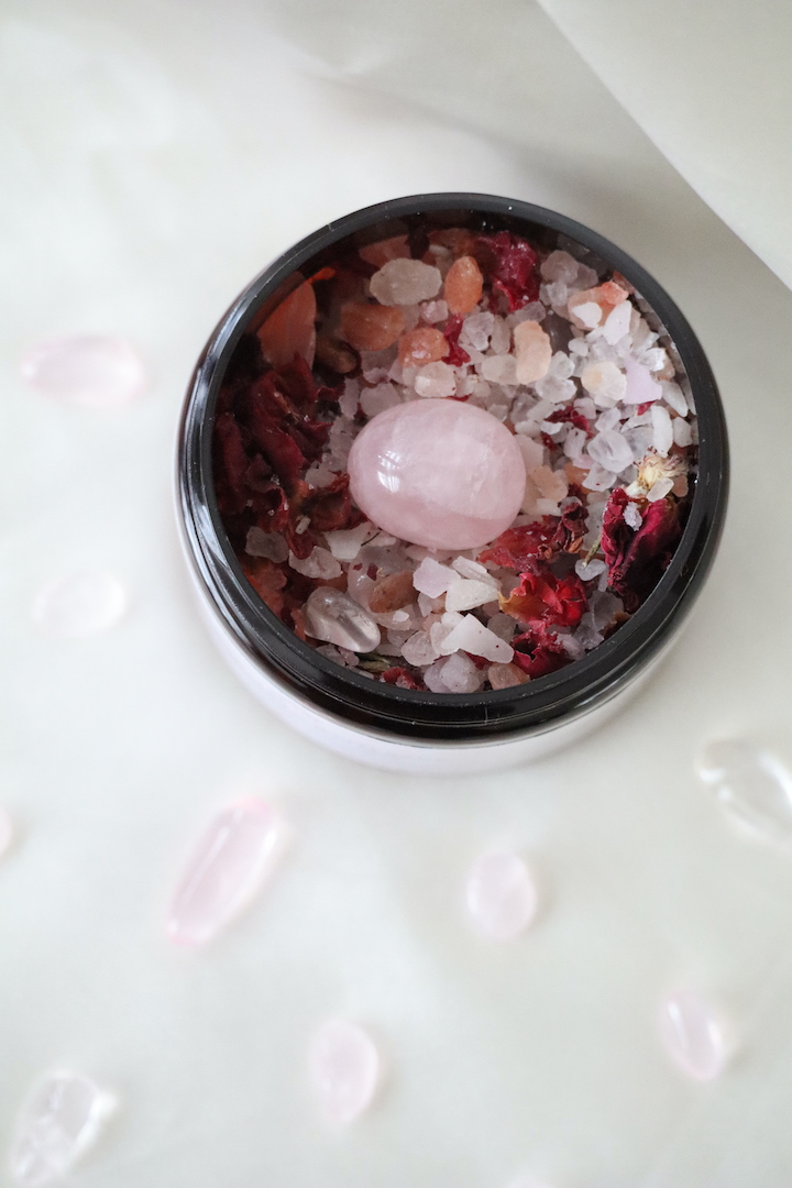 In het midden van iedere pot vind je een Rozenkwarts trommelsteen, bedoeld om vast te houden of naast het bad te leggen als anker voor je intentie. Daarnaast is het hele badzout verrijkt met kleine rozenkwarts steentjes, zodat de energie van liefde, zachtheid en harthelende vibratie volledig in het water wordt vrijgegeven.