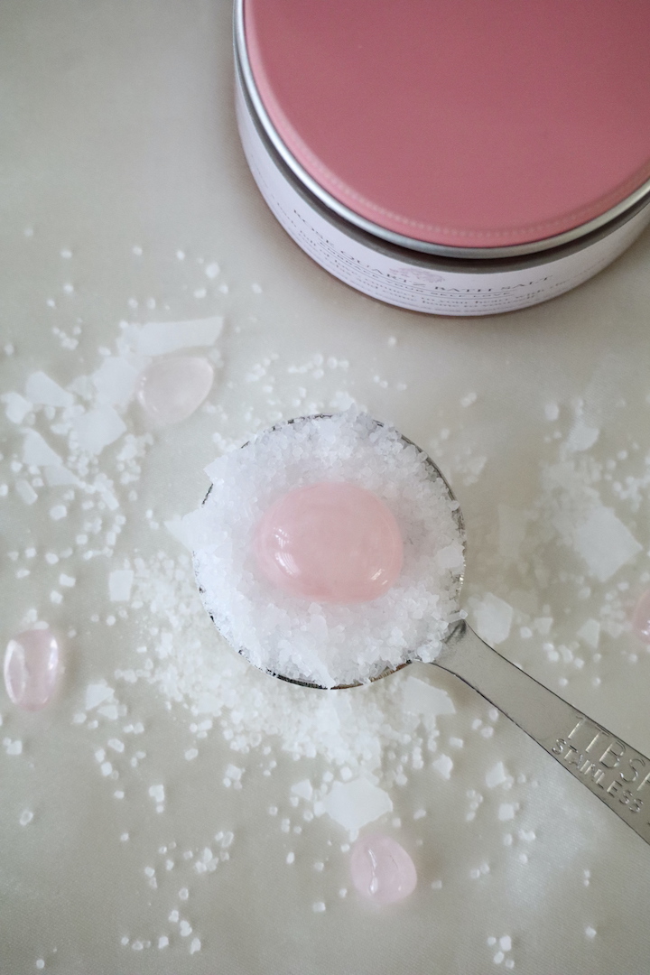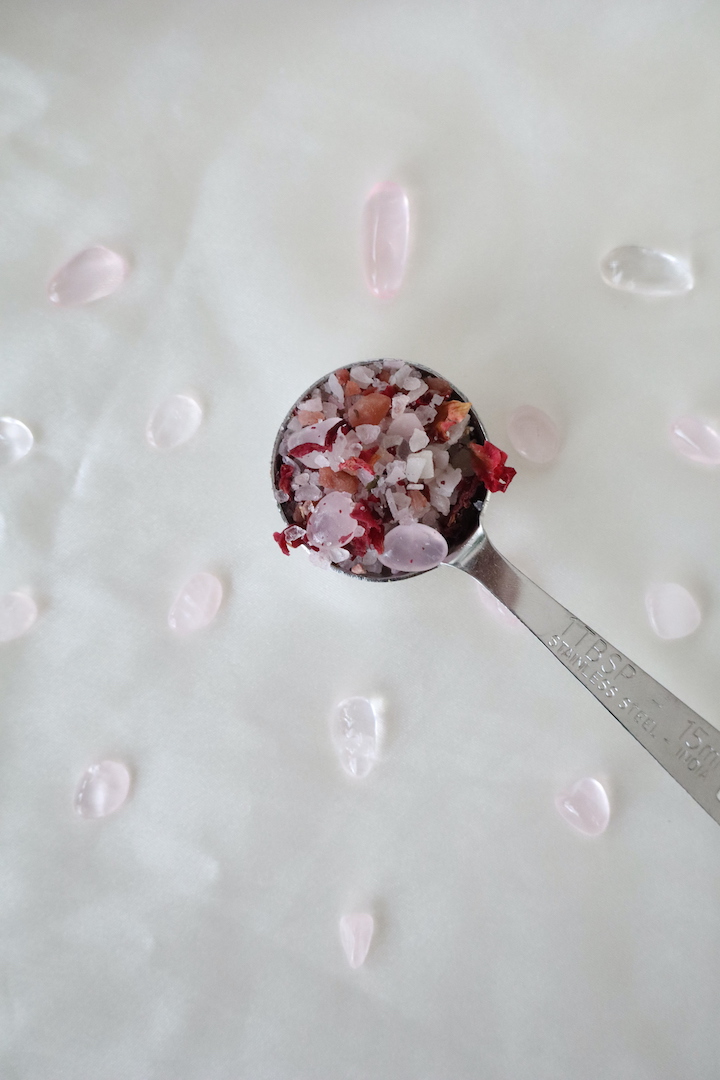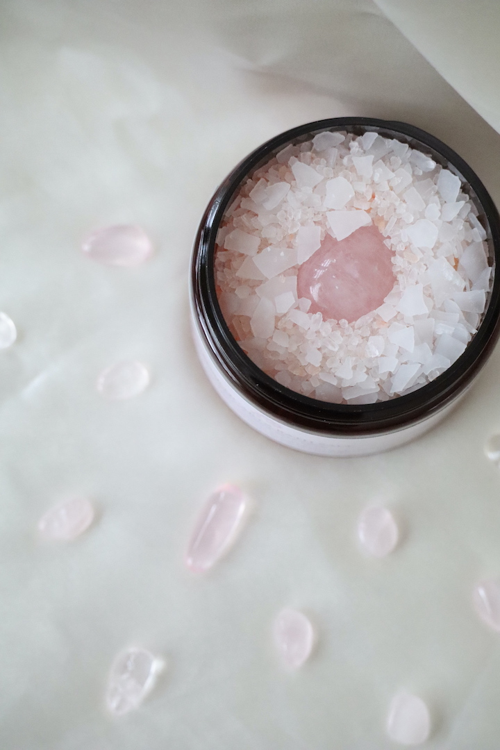 Vul het bad met warm water. Schep rustig het badzout in het water en neem de rozenkwarts trommelsteen even in je handen. Voel de koelte van de steen, stel een zachte intentie: