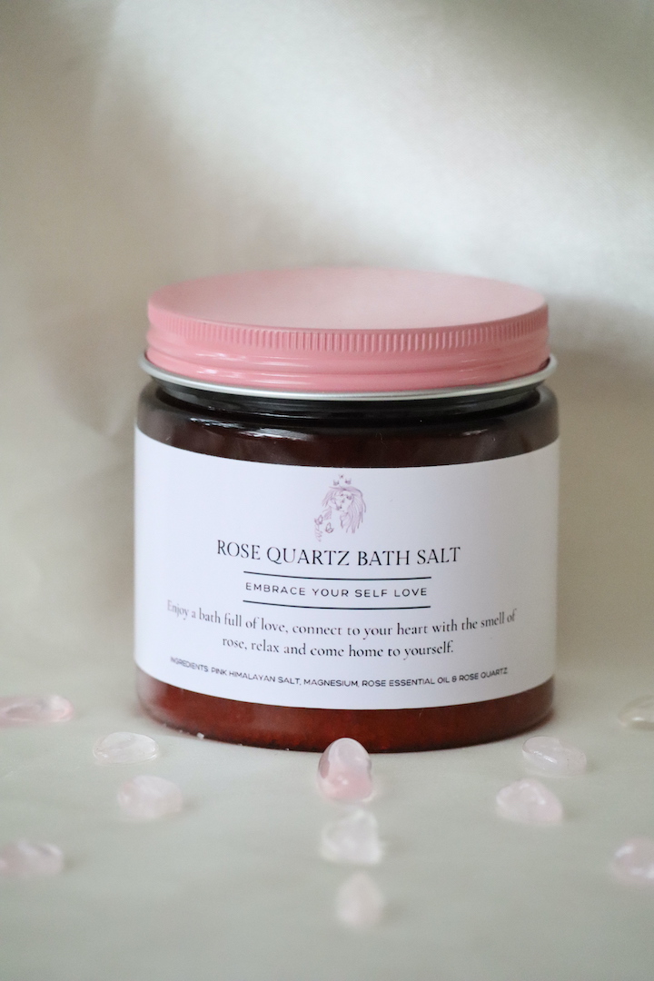 Een luxe, handgemaakt badzout uit de Embrace Your Self-Love Lijn met Himalayazout, magnesium, etherische rozenolie, een rozenkwarts trommelsteen en kleine rozenkwarts steentjes. Verkrijgbaar als 250 g zonder bloemen of 220 g met bloemen (inclusief zakje). Een zacht ritueel voor ontspanning en hartenergie.
