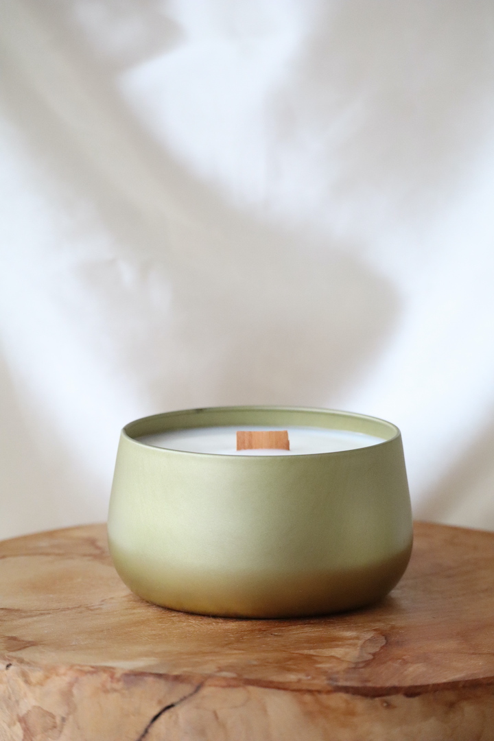 De kaars bevat een houten lont, die bij het branden een subtiel knisperend geluid kan geven en zorgt voor een rustige, brede vlam.