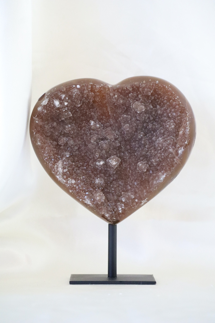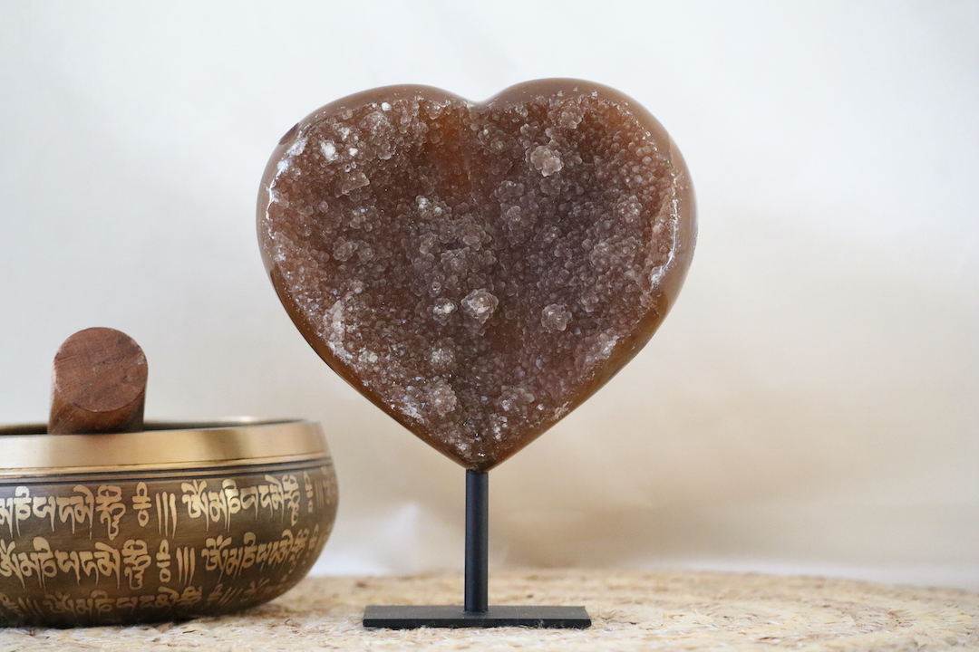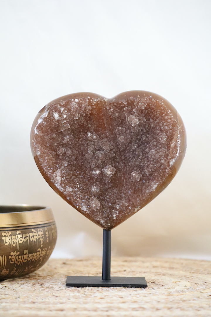 Een Sugar Druzy Agaat hart op standaard met fijne kristalstructuur en warme aardetinten. Een royaal en rustgevend statement voor een bewust interieur.