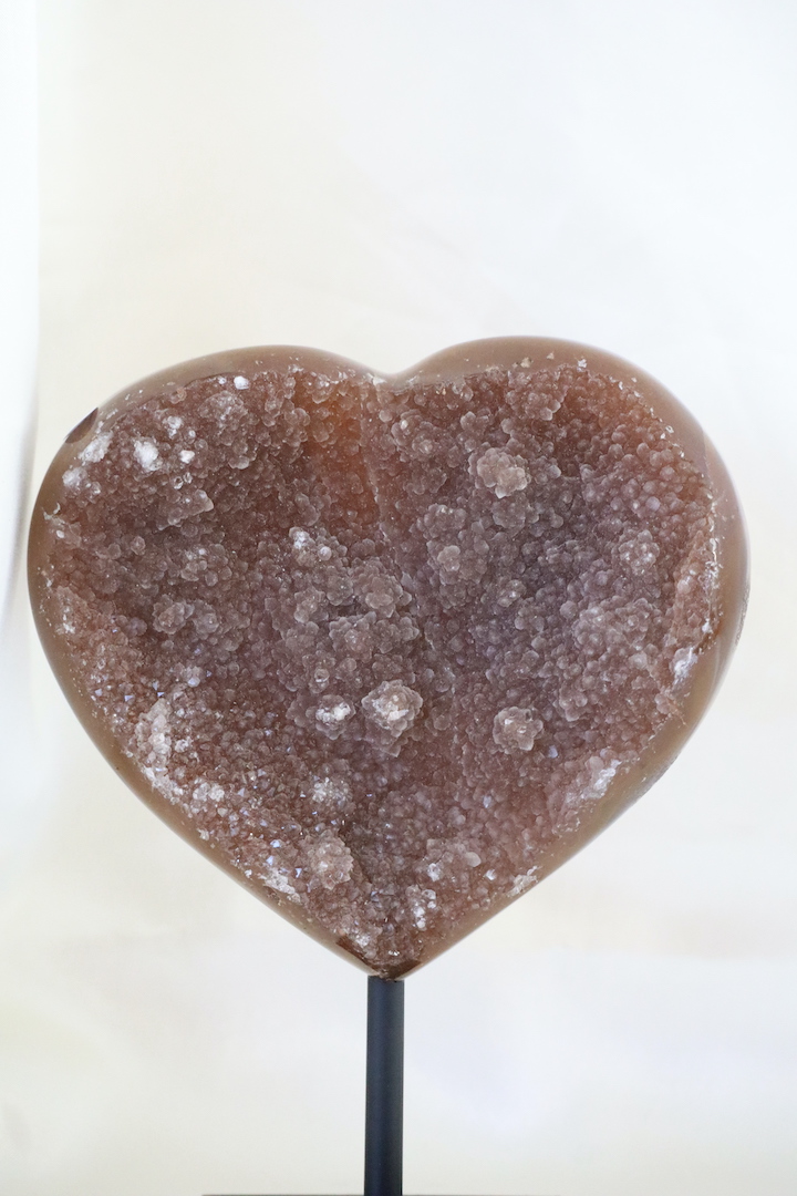 Sugar druzy bestaat uit zeer kleine, dicht op elkaar liggende kristallen die samen een poederachtige glans creëren. In tegenstelling tot grovere druzy-formaties is deze structuur ingetogen en zacht van uitstraling. Het licht wordt gelijkmatig gereflecteerd, waardoor het hart levendig oogt zonder te fonkelen of visueel onrustig te worden. Dit maakt sugar druzy bijzonder passend binnen een interieur waarin rust en verfijning centraal staan.