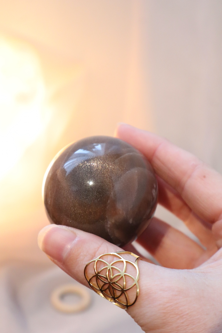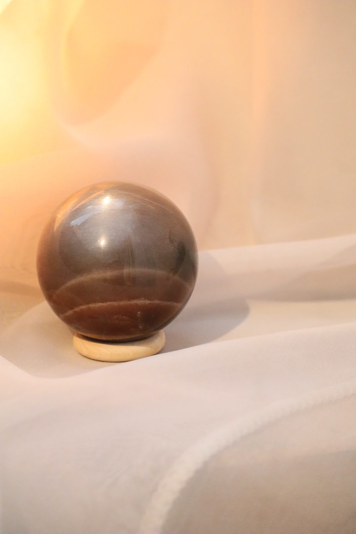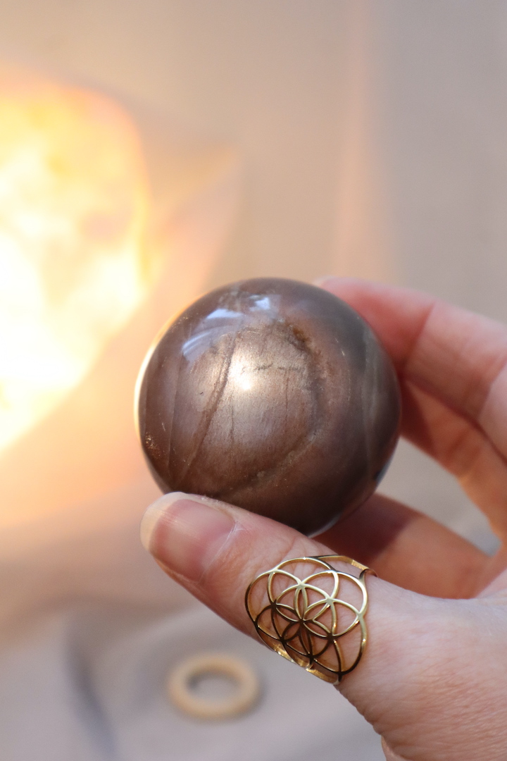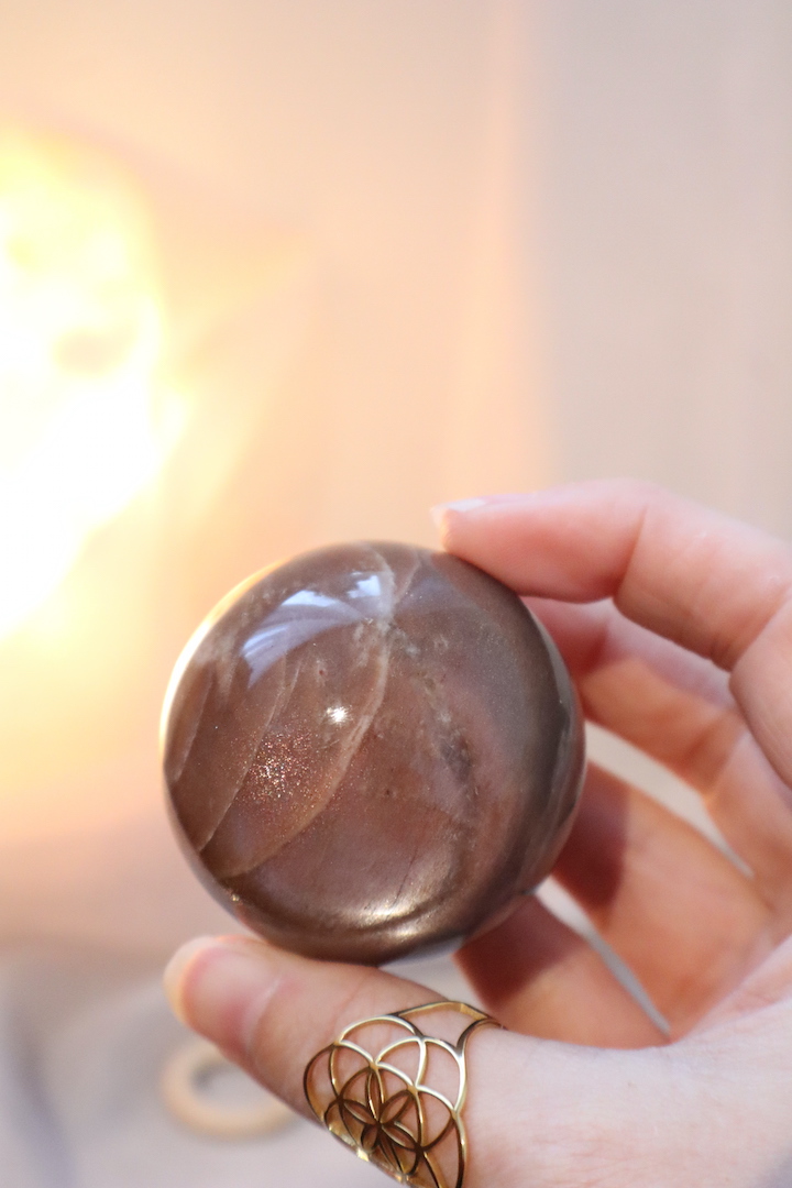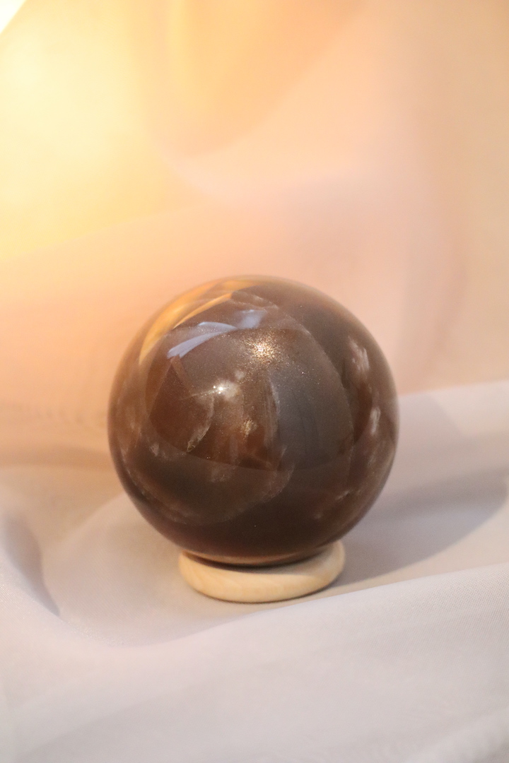 Zwarte Perzik Maansteen met Zonnesteen bol (5,2 cm). Een zeldzame, luxe steen met diepe cacao-tinten, zachte maansteenpatronen en een warme gouden shimmer. Ideaal voor rust, intuïtie, bescherming en self-care rituelen.