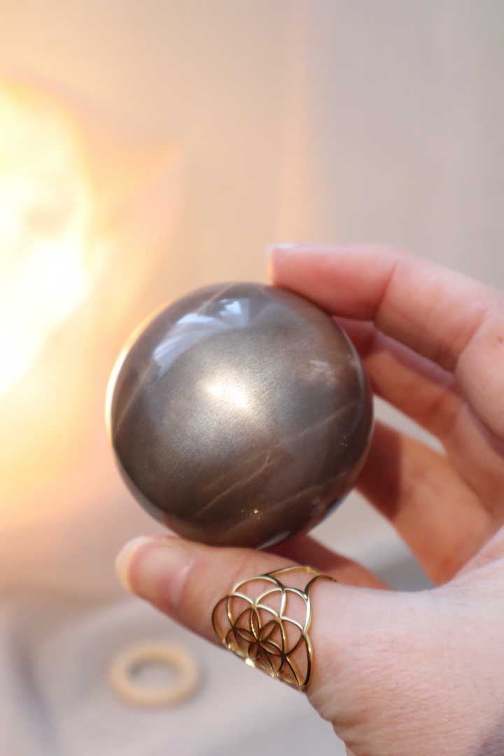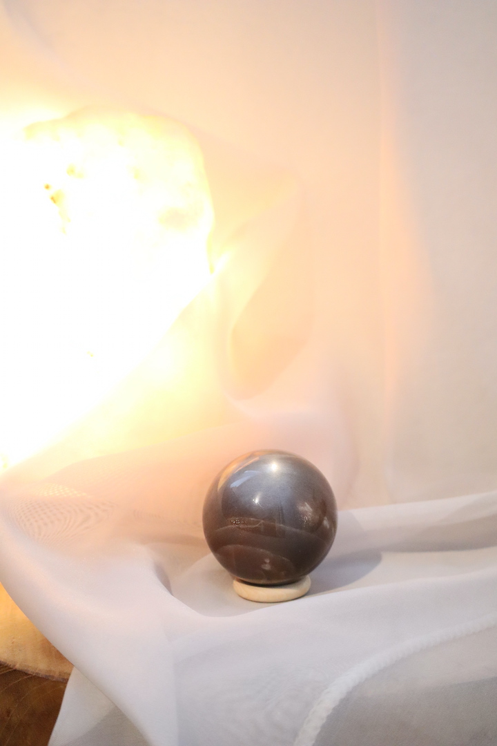 Zonnesteen komt niet vanzelfsprekend voor in Maansteen, en wanneer deze twee mineralen samen groeien, ontstaat er een steen die zowel visueel als energetisch een diepe, warme gloed draagt. Deze bol heeft een prachtige subtiele flash: gouden sprankels die zichtbaar worden wanneer het licht over de donkere basis glijdt. Het is precies deze combinatie die deze bol zo geliefd maakt — elegant, zeldzaam en energetisch krachtig.